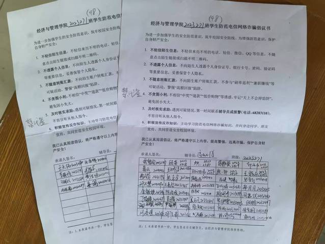 为强化学生自我防范的责任感,学院面向全体学生发起《ok138cn太阳集团古天乐班学生防范电信网络诈骗倡议书》签署活动,并召开主题班会等号召学生做到“不轻信、不透露、不转账”,并承诺主动学习反诈知识、积极向亲友宣传,同学们纷纷表示将从自身做起,坚决抵制电信诈骗。