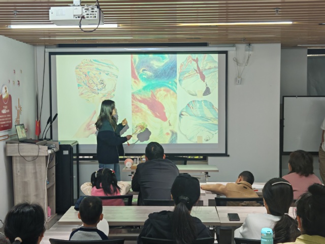 4月12日,滴水链岸社区活动室内洋溢着孩子们的欢声笑语。鸿雁宣讲团成员以“漆扇入夏”为主题,通过图文并茂的讲解,带领社区儿童追溯漆扇历史。动手实践环节中,宣讲团成员指导孩子们调配彩漆、设计纹样,将素白团扇浸染成独一无 二的艺术品。孩子们兴奋地展示自己的作品,并在贺卡上写下对远方伙伴的祝福:“希望湖南的小朋友喜欢我的漆扇,夏天我们一起用它扇风!”