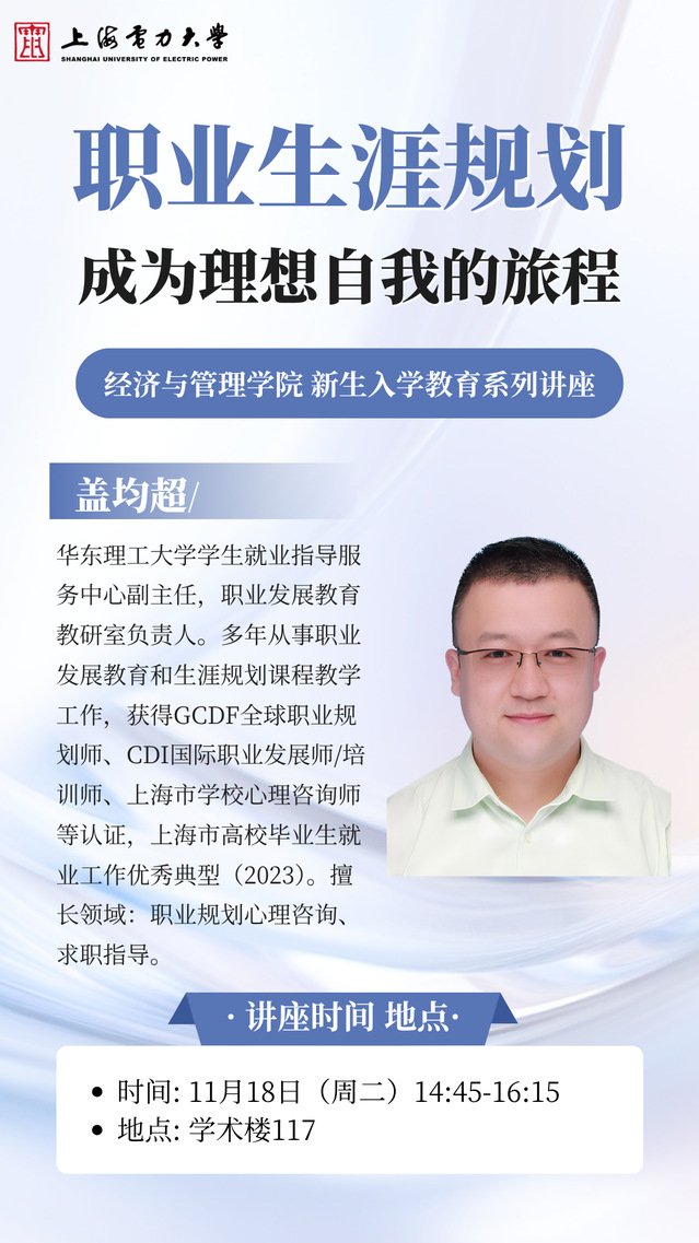 为引导新生树立科学的职业发展观念,提升生涯规划意识。11月18日,经管学院开展入学教育——职业生涯规划专题讲座。本次活动特邀华东理工大学学生就业指导服务中心副主任、职业发展教育教研室负责人盖钧超担任主讲人,以“职业生涯规划——成为理想自我的旅程”为主题,通过系统阐释五大核心理论,为同学们构建科学的生涯规划认知体系,从提升认知到付诸实践,全方位明确大学发展路径与职业探索方向。