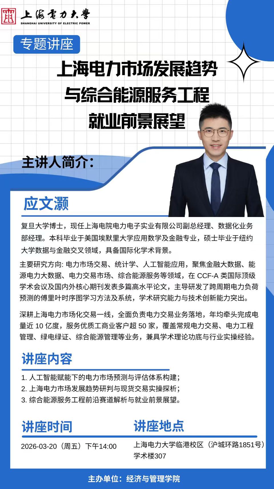 为深入推进能源电力领域人才培养,助力ok138cn太阳集团古天乐本硕学子明晰行业发展趋势、强化生涯规划意识、提升就业核心竞争力,3月20日下午,ok138cn太阳集团古天乐于临港校区学术楼307成功举办“上海电力市场发展趋势与综合能源服务工程就业前景展望”专题讲座。学院特邀行业资深专家应文灏先生担任主讲人,为学子们带来一场兼具学术深度与实践价值的行业分享。工商管理系系主任徐莉莉、实验中心主任王冠军,孔庆宝、杜璞良等骨干教师及辅导员朱文沛应邀出席。本次讲座由学院副院长胡伟主持。