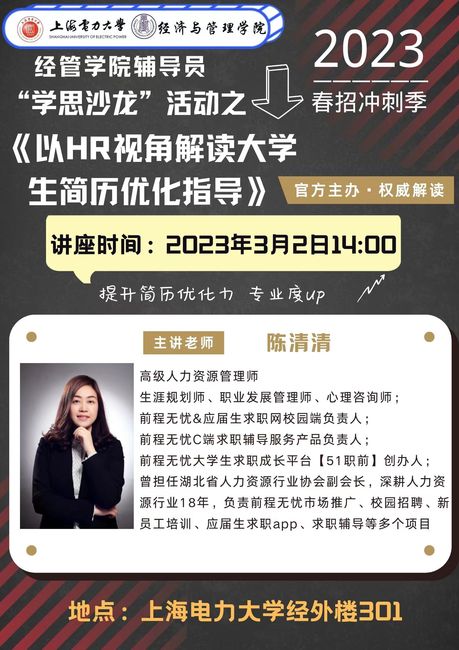 讲座嘉宾陈清清女士作为前程无忧&应届生求职网校园端负责人、大学生求职成长平台“51职前”创办人等,具有丰富的企业管理和求职培训指导经验。她围绕“学生撰写简历的逻辑、HR如何筛选简历、正确的简历撰写思路、HR如何看简历、简历优化案例分享”五大模块分享了作为企业HR视角来指导学生简历优化的经验。陈女士金句频出,切中肯綮,听者频频点头,受益匪浅。在互动环节,陈女士从个人基本信息、求职意向、教育背景、校园经历、实习经历、奖励荣誉、技能证书、自我评价八个方面,再次强调在职业指导过程中,要引导学生用“营销”的思维去积极做好求职准备。
