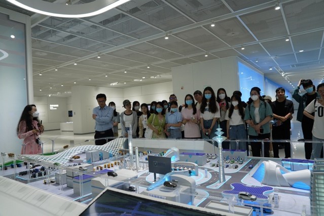交流座谈后,在张诗笳的带领讲解下,师生一行参观了协鑫未来能源馆。协鑫未来能源馆是我国首座由企业自主创意、策展的全息式、交互式综合能源展示场馆,展示面积4300平方米,采用先进的展示技术和手段,展现能源科学原理、能源新技术、能源的未来、能源与生活的关系等内容,是了解能源技术和文化的窗口、能源专业人士的研究交流平台。通过参观学习,师生们充分了解了协鑫集团的企业文化、企业使命和企业愿景以及协鑫集团在“双碳”战略下的产业布局和企业在能源数字化、智能化方面取得的相关成绩。