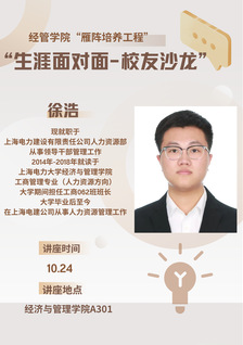 我院18届毕业生徐浩,现就职于上海电力建设有限责任公司人力资源部。作为本次的主讲嘉宾,他介绍了自己从大学生活到备战考研再到求职探索的成长之路,讲述了自己在所属的公司岗位去创造价值的过程与自己收获过程的自我成就感,他鼓励同学们大胆尝试,为自己的未来而迈进坚实的步伐。此外,他以自己多年人力资源工作的从业经验,在求职方向、能力提升、素质培养等方面和同学们展开了深入的交流。