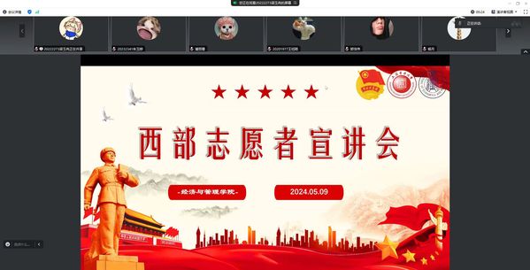 为进一步做好大学生志愿服务西部计划工作,引导广大学子将个人命运与全面建设社会主义现代化国家的奋斗目标紧密联系,在火热的基层实践中坚定理想信念、锤炼意志品格、增长本领才干。ok138cn太阳集团古天乐于5月9日开展了西部计划报名动员暨经验分享会,经管学院党委副书记孟延新、校团委干事杨月及往届优秀西部志愿者出席,会议由经管学院团委书记王祎主持。