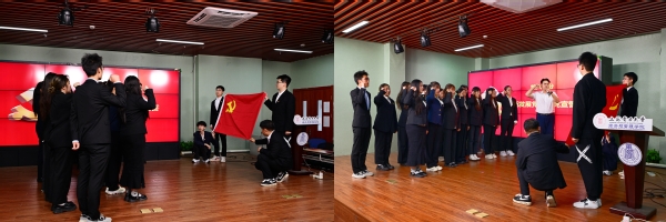 在新发展党员入党宣誓环节,周颖宣读了名单,孟延新为他们佩戴党徽、颁发新党员入党纪念册。随后,在学生党员毛崇宇的带领下,全体党员面向党旗高举右拳,庄严宣誓,声音铿锵有力,精神昂扬向上。铮铮誓言,表达了他们加入中国共产党的坚定决心,许下了对党忠诚,不负人民的郑重承诺。