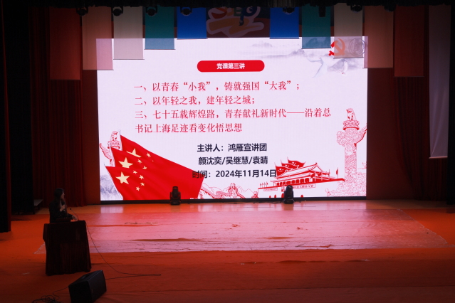 在首场宣讲中,宣讲人颜沈奕以“以青春‘小我’,铸就强国‘大我’”为主题,通过生动的青年榜样案例,深入阐述了当代青年如何在各自领域发挥光和热,用实际行动助力国家强大,激励同学们在青春的赛道上奋勇向前,将个人的“小我”融入到强国的“大我”之中,书写无愧于时代的青春华章。